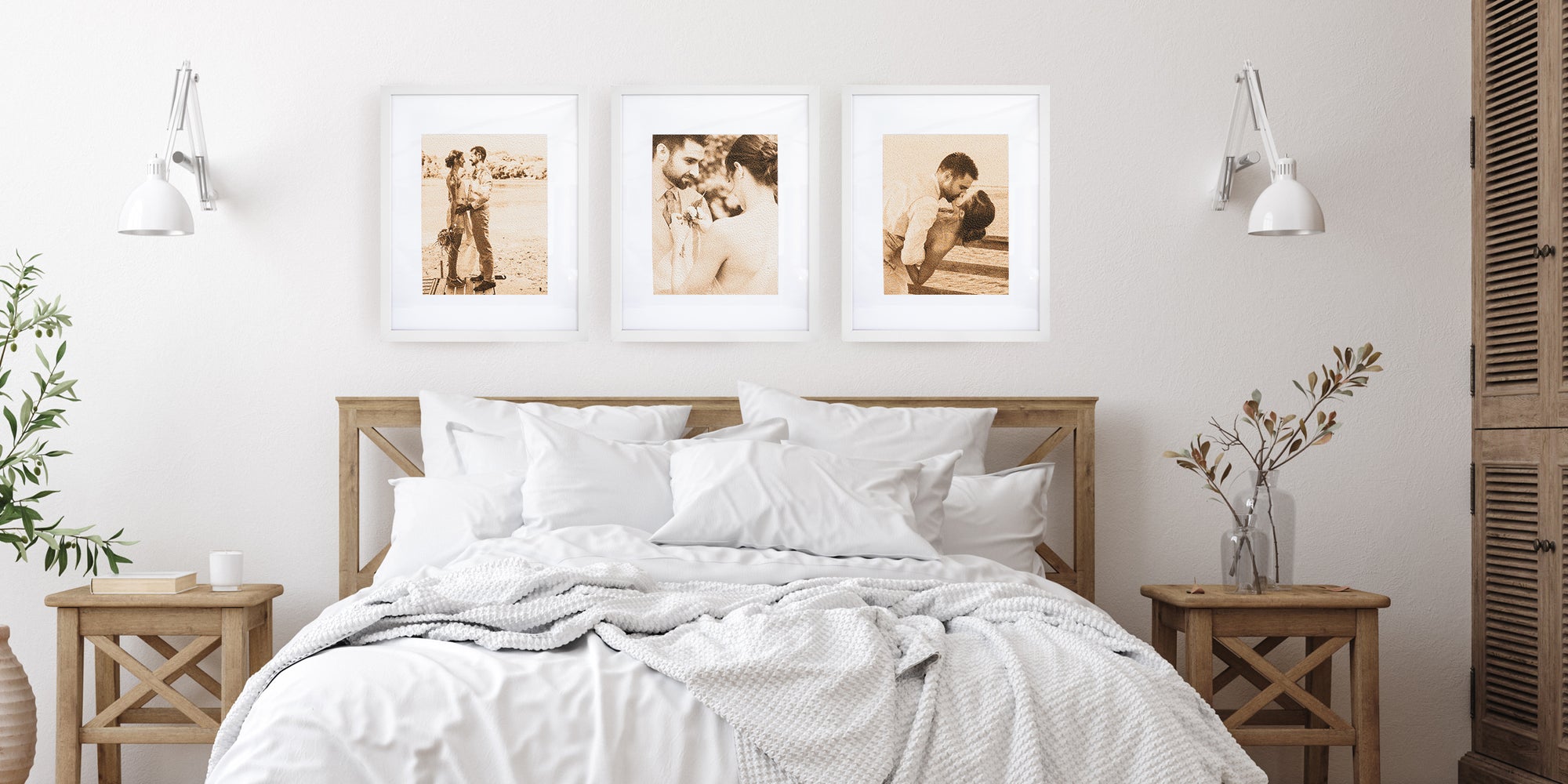 Slide the arrows on the image below to see before and after mockup! (Featuring 3, 11"x14" Engraved Photos, matted in our 16"x20" white frame.) Previews are digital designs meant to represent what the engravings will look like. Final colors, texture and actual engravings may vary in real life.